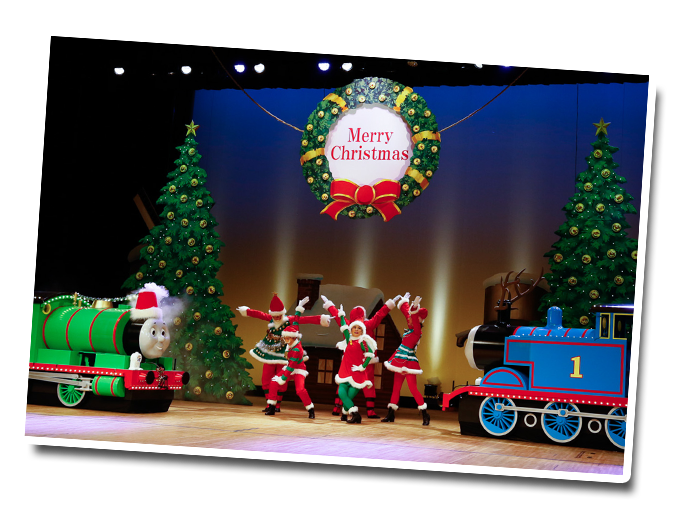 トーマスとパーシーもクリスマスモードで登場するよ! 大スクリーンいっぱいの映像もお楽しみに!